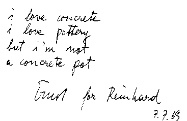 Damit bekommt die Jandlsche Positionsbestimmung aus dem Jahre 1969, i love concrete / i love pottery / but i'm not / a concrete pot, ein besonderes Gewicht, das sich noch verstärkt, wenn Jandl diese Widmung unterschreibt: Ernst for Reinhard, und damit den Text an mich addressiert, wohl wissend, daß sich eine Unterschrift in dieser Form auch auflösen läßt im Sinne: von ernst(haft) für Reinhard.